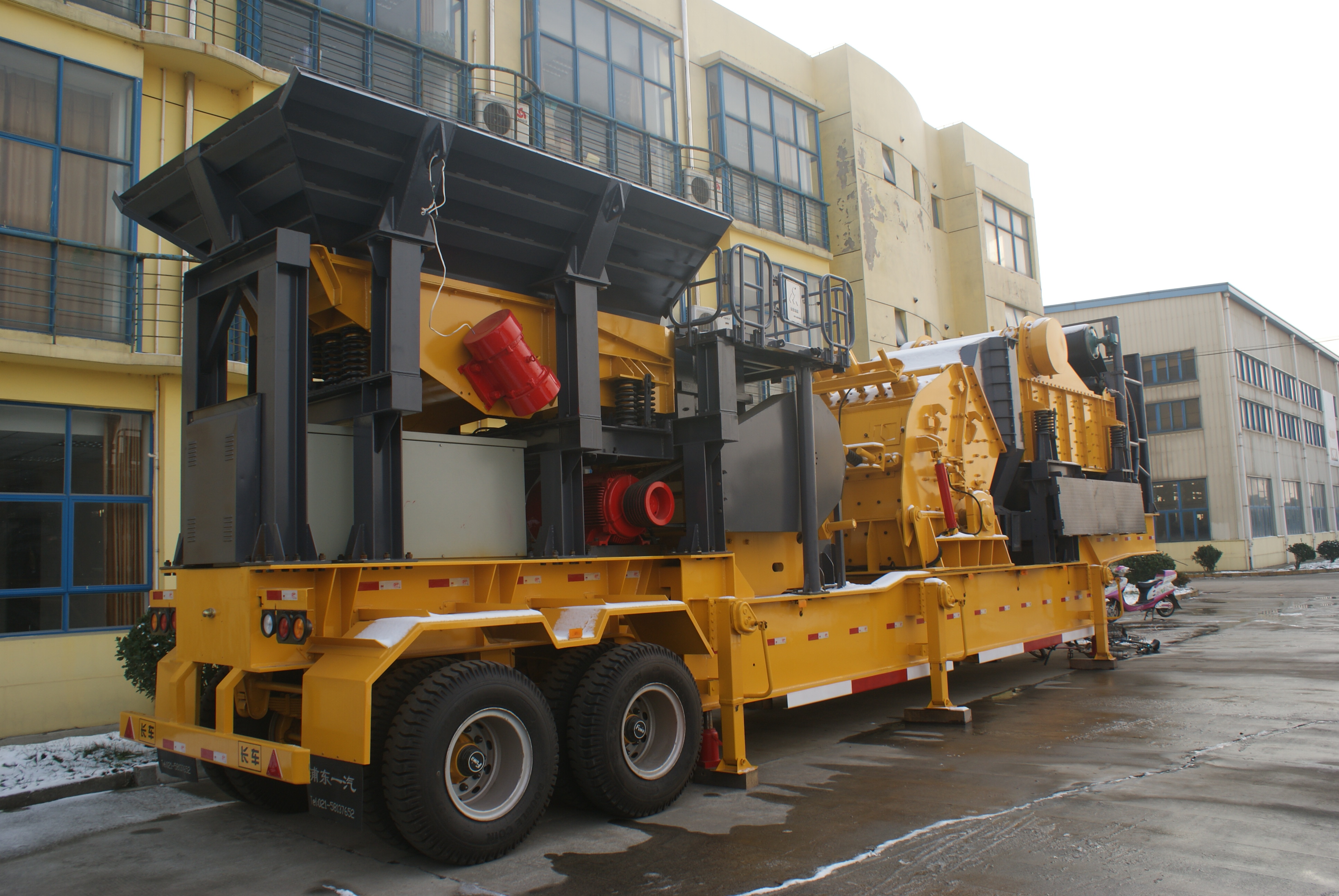 輪胎式移動式破碎站,基本是一體化的整套破碎生產線集合,根據破碎要求可裝配振動篩和給料機,篩下皮帶輸送機、振動篩、破碎機等一體化的車載安裝,轉向牽引軸,在任何地形條件下,此設備均可達到工作場地的任意位置。