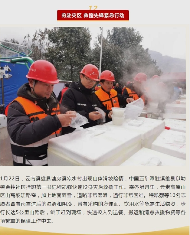2024年1月22日,中國五礦定點幫扶的云南省鎮雄縣塘房鎮涼水村發生山體滑坡。災害發生后,習近平總書記高度重視并作出重要指示,要求迅速組織救援力量,全力搜救失聯人員,盡最大努力減少人員傷亡。中國五礦黨組第一時間部署落實,緊急向鎮雄縣捐贈600萬元支持搶險救災和災后重建工作,啟動應急預警,全力支持鎮雄搶險救災。派駐鎮雄縣掛職副縣長趕赴現場,作為一線救援指揮部成員參與后勤保障和救援協調工作;派駐鎮雄縣以勒鎮金鐘社區駐村第一書記加入救援志愿者隊伍;所屬中冶天工以勒五金產業園項目部派出5臺挖掘機、所屬二十三冶億聯生態城項目部委派10名志愿者積極投入救援行動,同步采購食品、飲用水等生活物資,馳援受災地區,為鎮雄搶險救災和災后重建貢獻了央企力量。